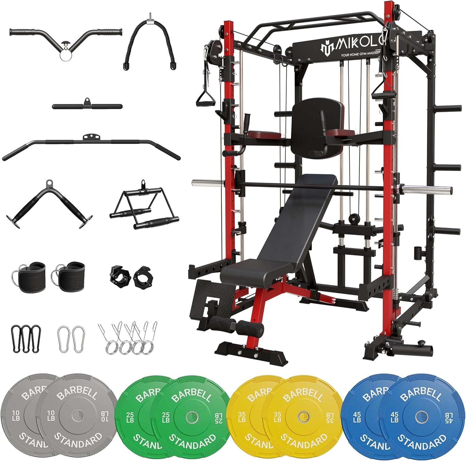 Mikolo 2000LB Multifunctional Power Cage Squat Rack with Cable Crossover Machine & Lat Pull Down System, Home Gym with 230LBS Weight Plates Set and Bench